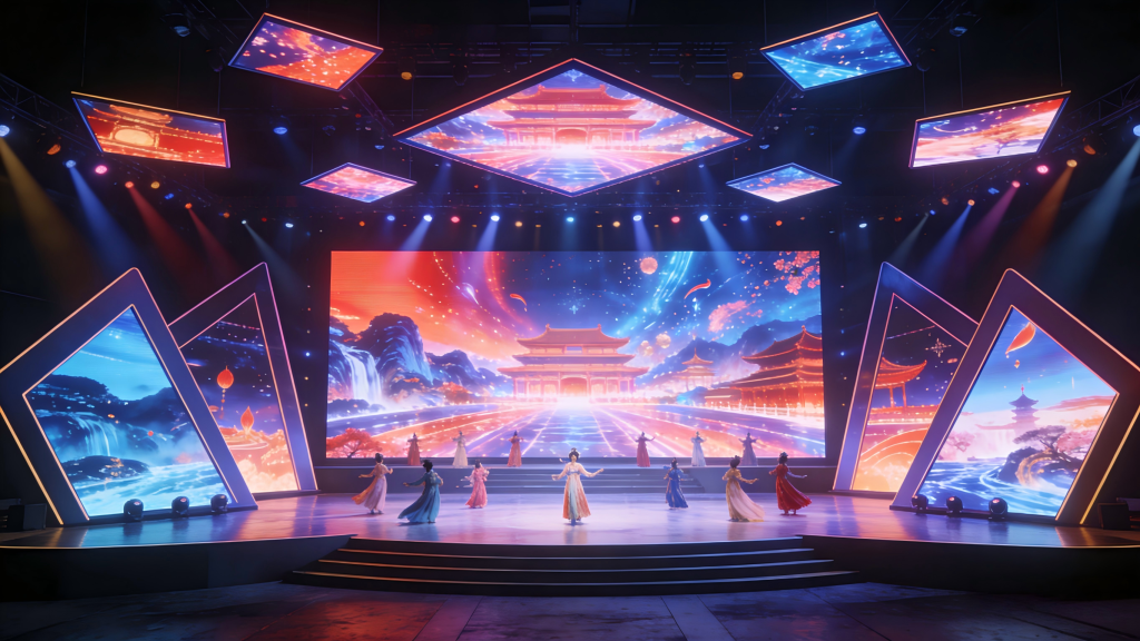 在文旅商演的舞台搭建中,LED显示屏已从单纯的背景展示升级为“视觉中枢”,超大型LED无缝拼接显示屏、可同步播放动态视频、实时特效与演出主题视觉内容,将演员的表演与虚拟场景深度融合,构建出虚实相生的舞台空间。